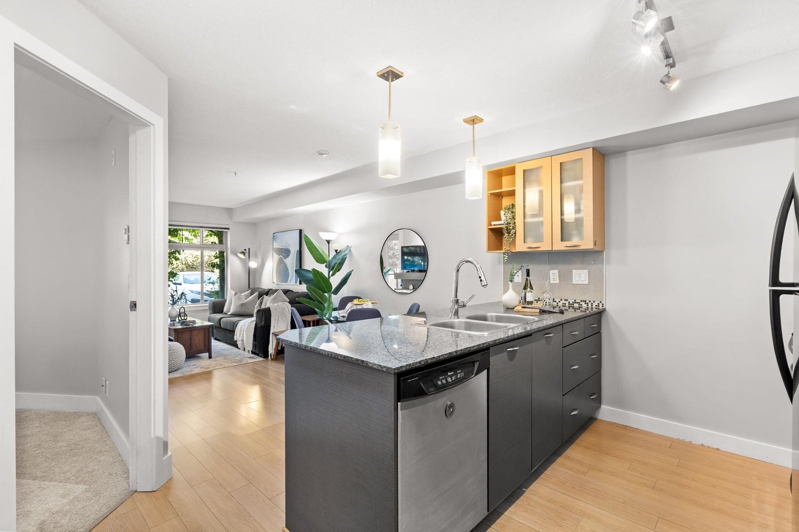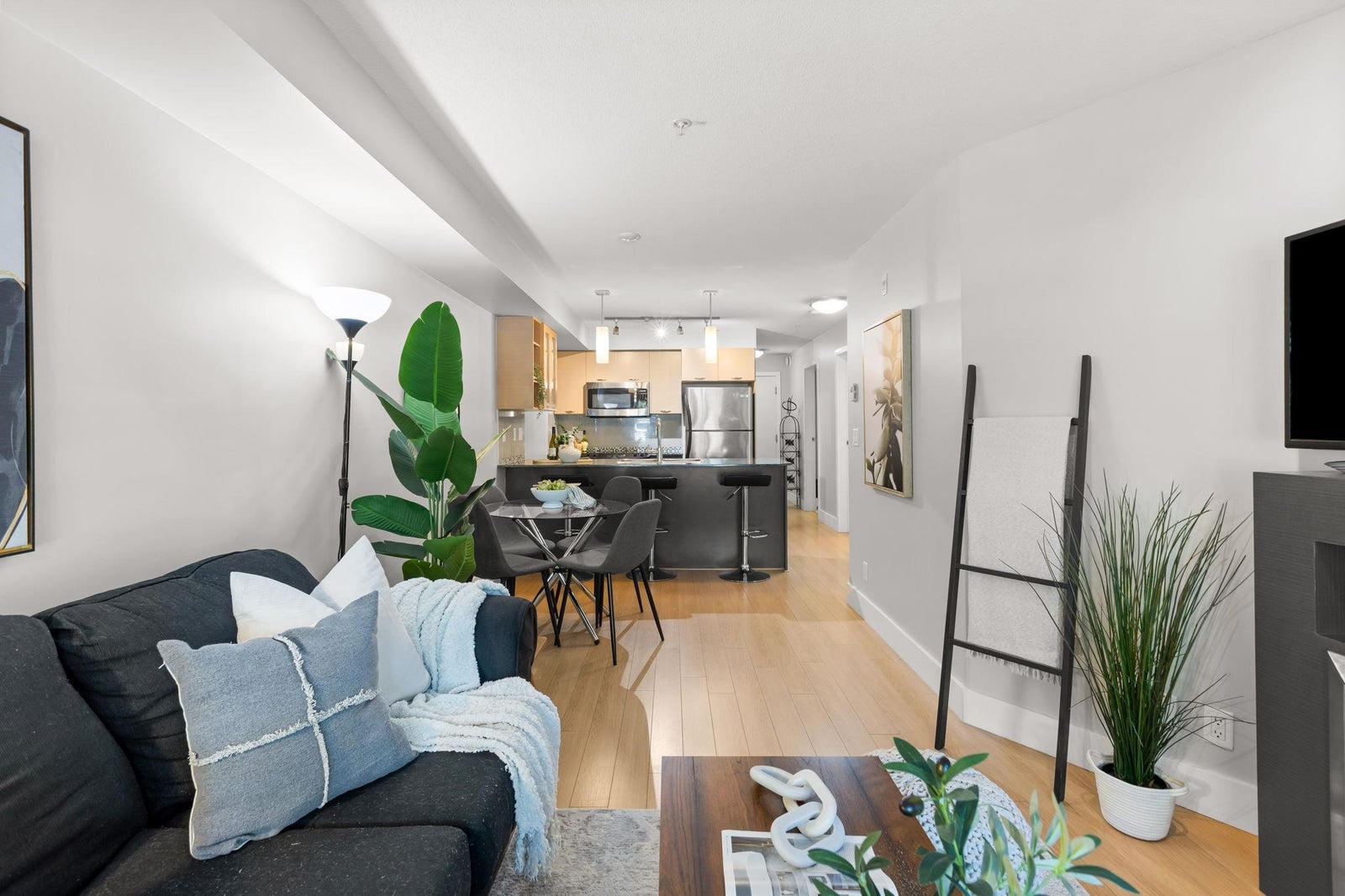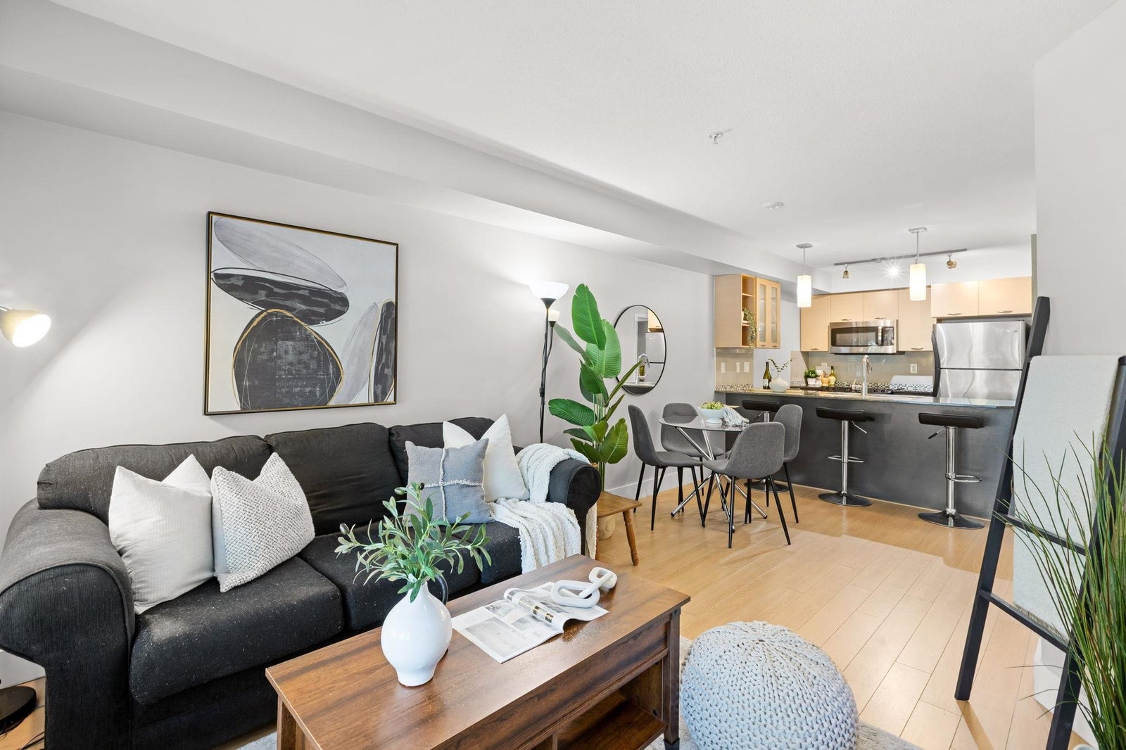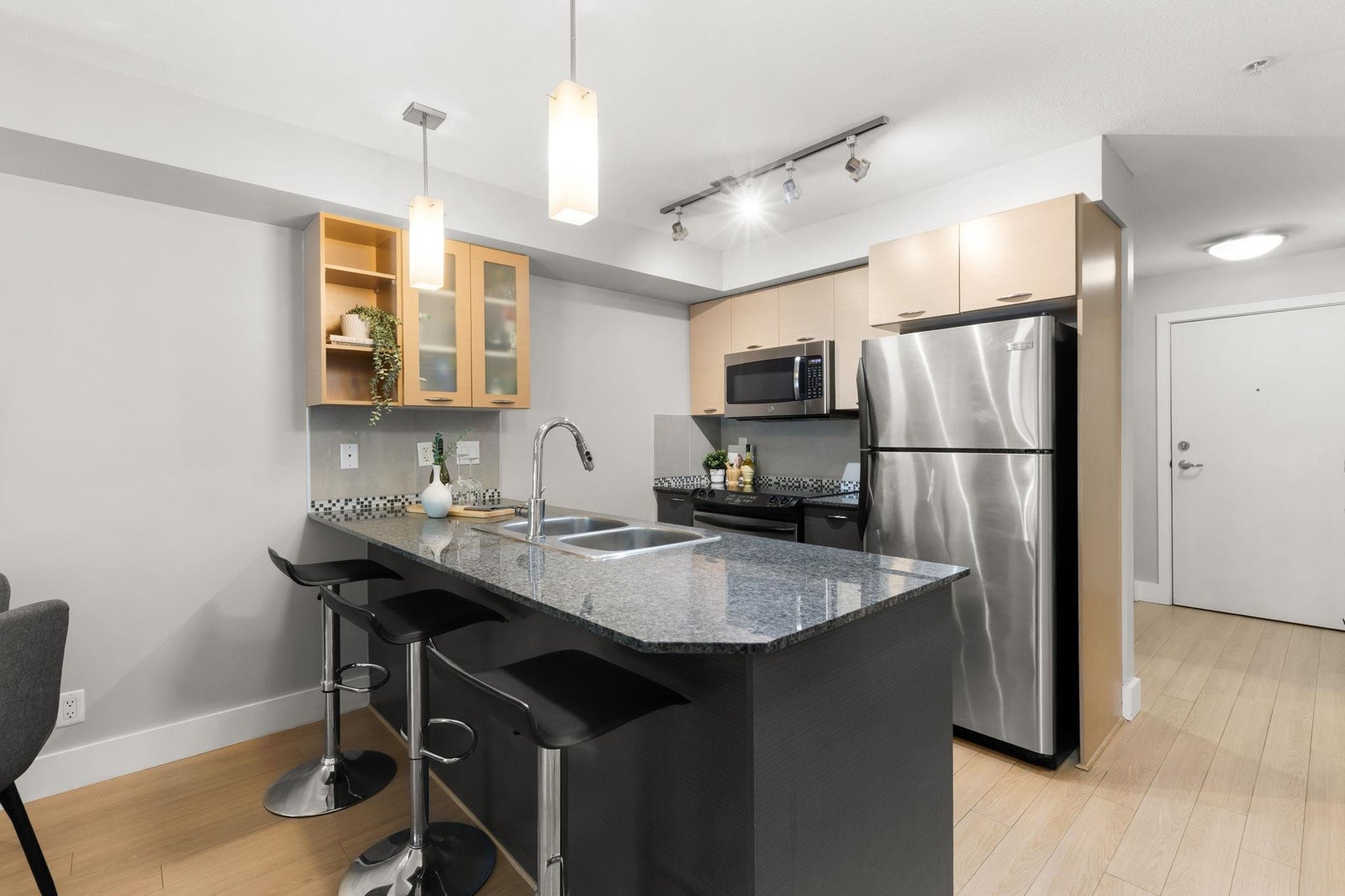 Welcome to this beautiful 1 bedroom + den at "Latitude". This thoughtfully designed ground-level suite combines comfort with contemporary flair. Enjoy an open-concept living area anchored by a cozy electric fireplace, flanked by seamless access to your private patio which is perfect for morning coffee or evening relaxation. The sleek kitchen boasts granite countertops, stainless steel appliances and the integrated eat-up bar enhances both function and entertaining ease. A generous den adds the finishing touch, offering the perfect space for a home office, nursery, or creative nook. The building features a well-equipped fitness room, billiards room, and two guest suites available for nightly rental—an ideal touch for hosting friends or family. 1 Parking & 1 Storage.